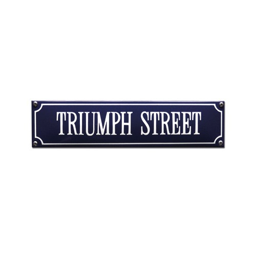 emaille straatnaambord triumph streetGebold blauw / wit emaille straatnaambord met de tekst triumph street waarvan de witte kleurlaag voelbaar is (gesjabloneerd ge-emailleerd). Het formaat is 33x8 cm. Geschikt voor buiten gebruik. (Beide zijdes zijn voorzien van een…