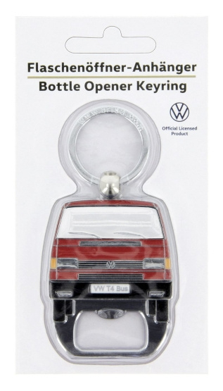 Praktische sleutelhanger met VW T4 Bus rood. De Volkswagen sleutelhanger heeft een geïntegreerde flesopener. Handig en stijlvol, en altijd iets bij de hand om flessen te openen. Het oppervlak is verchroomd met hard email. Deze praktische gadget bundelt al je sleutels op een handige en leuke manier. Formaat: 4 x 9 x 0,4 cm. De keyring is verpakt in in een blister verpakking.