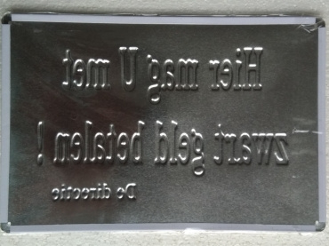 Blikken bord Hier mag u met zwart geld betalen! De directie. De afbeelding is voelbaar (reliëf, 3D). De metalen wandplaat is gebold met omgebogen rand. Het formaat is 20x30 cm. Categorie: horeca, tekstbord.