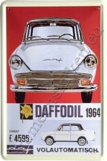 Nederlandse metalen reclamebord van Daf (31) model daffodil uit 1964. Uitgevoerd met beige licht gebogen rand en een beetje gebold. Het formaat is 20x30 cm / A4. categorie auto auto`s, volautomatisch.