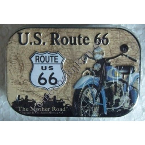 Metalen pepermunt doosje van U.S. route 66. De afbeelding is voelbaar in de deksel. Het formaat is 6 cm bij 4 cm en 1,7 cm hoog. Kan na het genieten altijd nog gebruikt worden voor andere snoepjes of als pillendoosje / medicijndoosje. R66, Art Nr. NA 81122