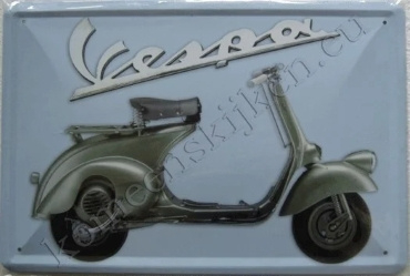 Geheel vlakke metalen koelkastmagneet van een Vespa scooter eenzitter. Betreft een oer-Vespa, de Vespa 125, produktieperiode rond 1949. Het formaat is 8 x 6 cm.
