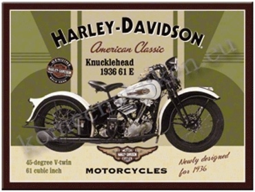 Geheel vlakke metalen koelkastmagneet met het Harley Davidson Knucklehead uit 1936. Het formaat is 8x6 cm. Nostalgic art.