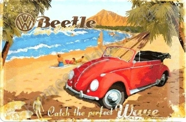 Metalen reclamebord catch the perfect wave. De afbeeldingen zijn in reliëf (voelbaar). Gebold met rond gebogen rand. Formaat 20x30 cm.. categorie: VW kever volkswagen surf, strand. Nostalgic art