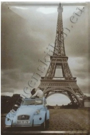 Blikken wandplaat van een lichtblauwe Citroën deux chevaux (2CV) voor de eifeltoren. Het wandbord is gebold met rond gebogen rand en 4 gaatjes om op te hangen. Het formaat van de wandplaat is 20 x 30 cm. Categorie: auto`s, Citroen, eend.