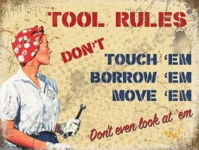Blikken muurbord met de tekst: tool rules don't touch 'em, borrow 'em, move 'em. Don't even look at 'em. De metalen wandplaat is geheel vlak en heeft 4 gaten voor de bevestiging. Formaat 40x30 cm. Categorie: tweewielers, auto's.
